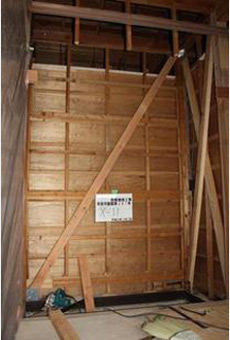 現況の壁の耐力を増すために、現況の筋違を金物補強したり、新規に筋違を入れます。また、構造用合板を張る場合もあります。